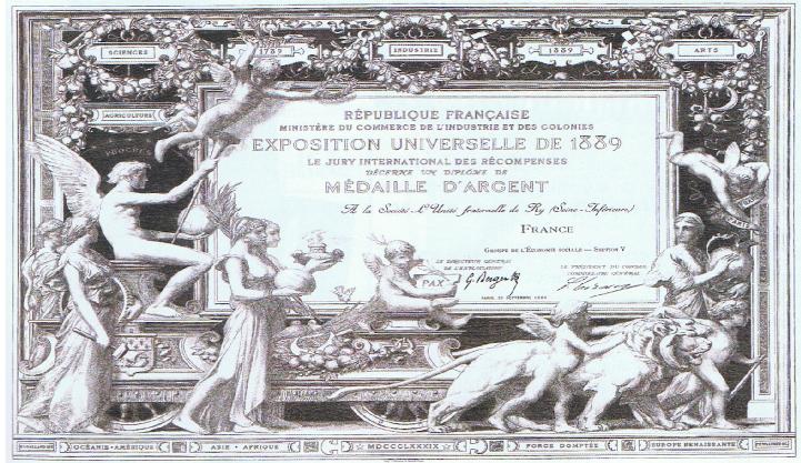 Ci-dessous, une copie de la couverture des statuts d'une société créée par Jouanne, ainsi que du diplôme d'une médaille d'argent décerné à cette même société.